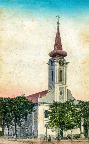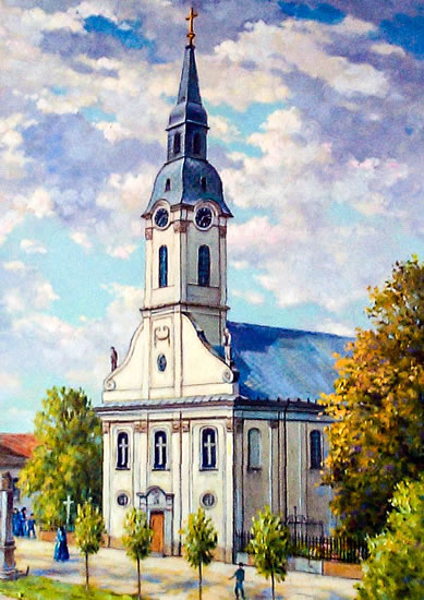 Die Kerneier Kirche - erbaut von 1791-1797 Die Zeichnung unten verdanken wir Anton Roth. Die Kirche ist 45,5 m lang und 15 m breit und der Turm ist 45,5 m hoch. Darin waren vier Glocken. Im Jahre 1925 fielen der Dachstuhl und die Turmhaube einem Brand zum Opfer. Die Buntglasfenster waren vor 1925 installiert |